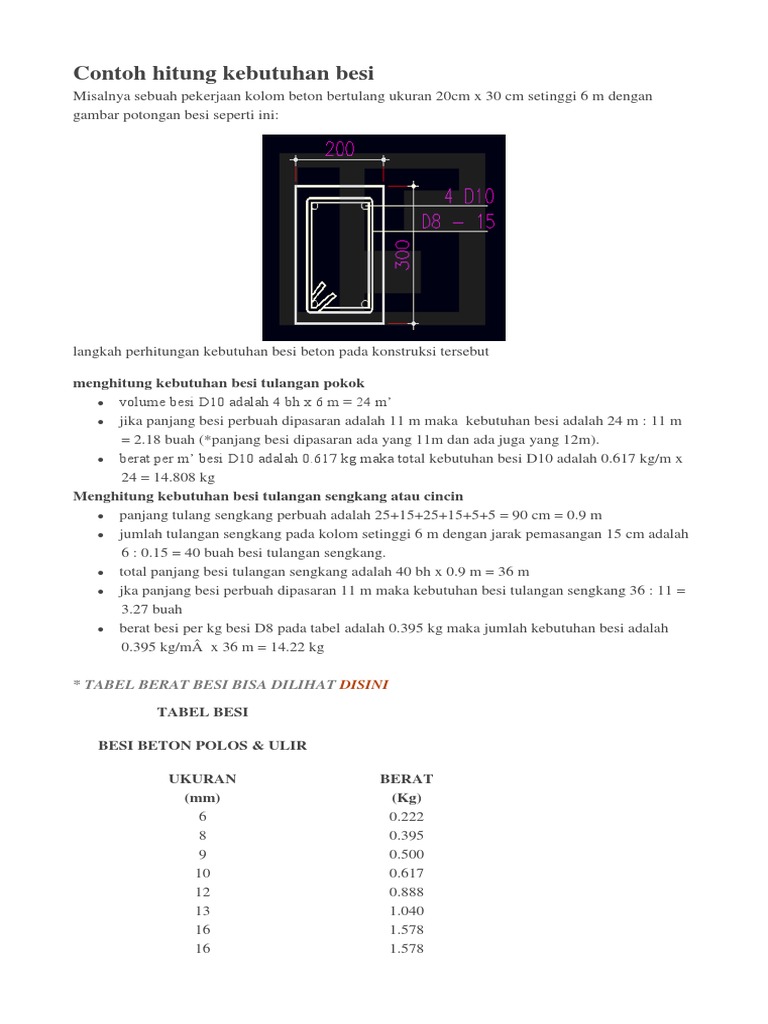 Berat besi polos diameter 10 mm Diameter besi 10 mm 0010 m Panjang kebutuhan besi polos 10 mm 20 batang 20 batang x 12 m 240 m Berat jenis besi 7850 kgm3 m3 Dari kedua cara tersebut didapatlah hasil akhir yang hampir sama mungkin hanya ada sedikit perbedaan untuk nilai koma dibelakangnya saja. Menghitung kebutuhan besi tulangan sengkang atau cincin panjang tulang sengkang perbuah adalah 2515251555 90 cm 09 m jumlah tulangan sengkang pada kolom setinggi 6 m dengan jarak pemasangan 15 cm adalah 6. Jumlah total batang besi beton d10.